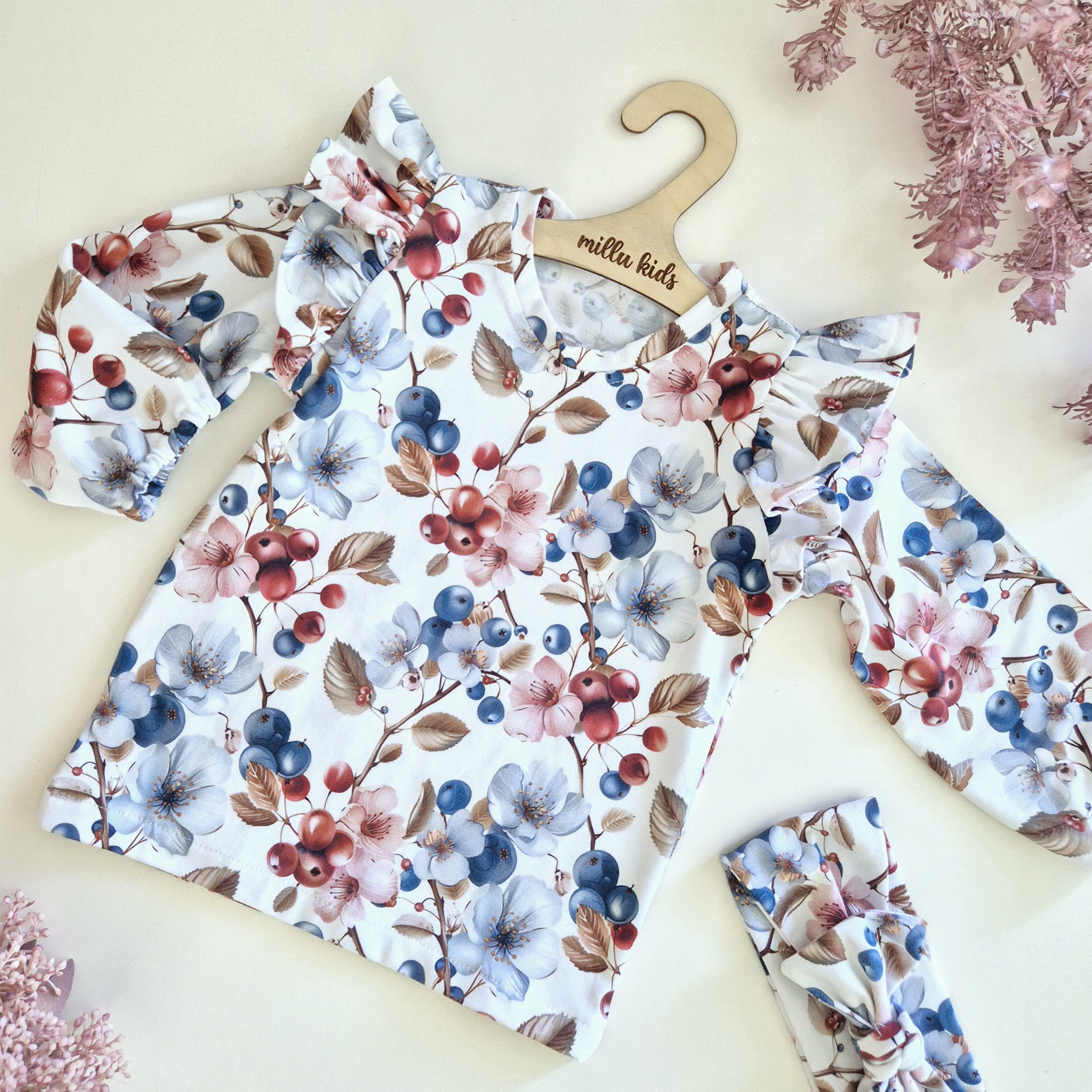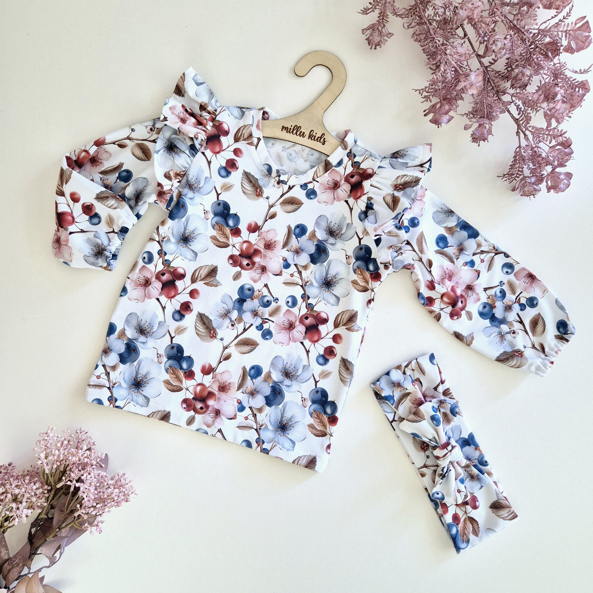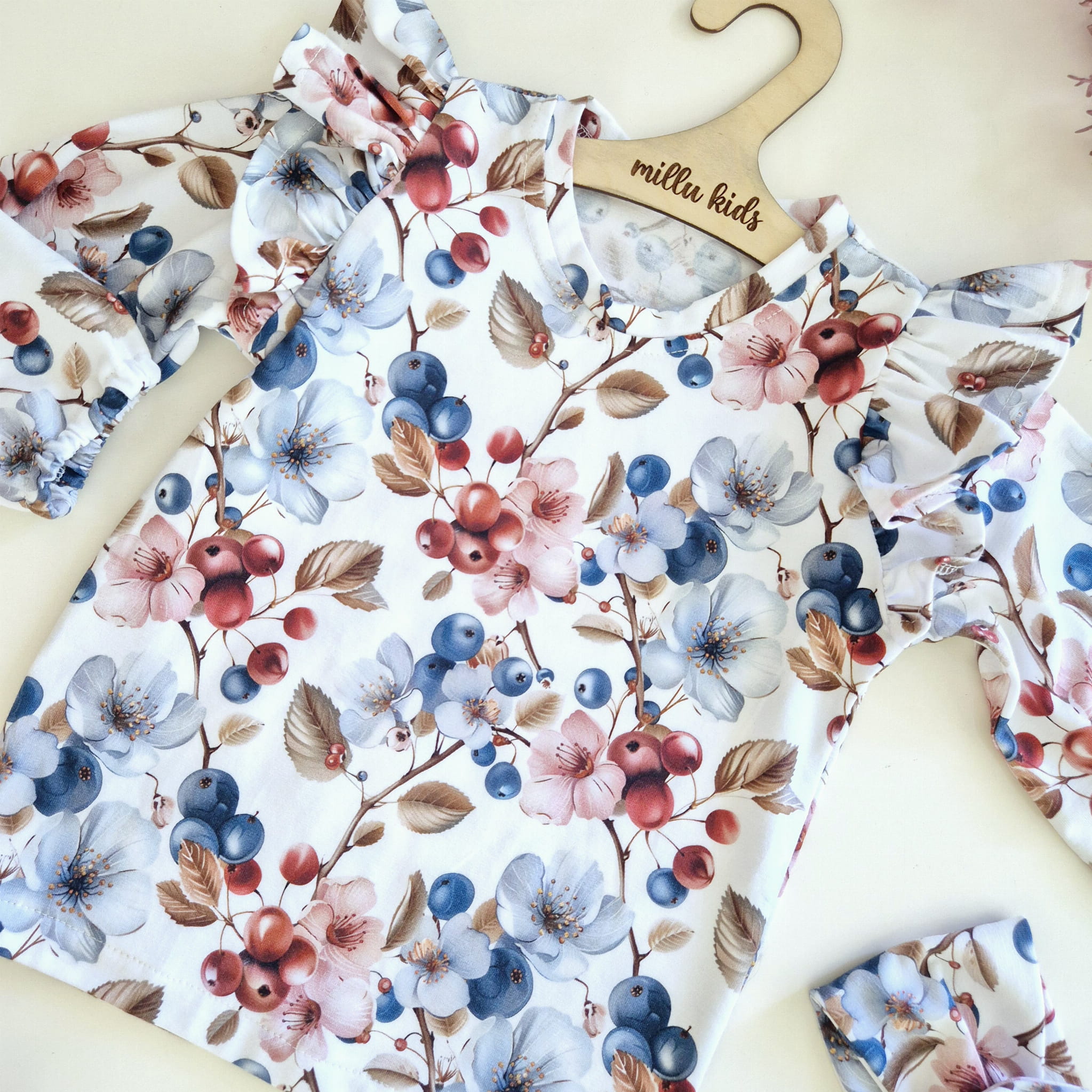 Bluzeczka w nadruk niebiesko różowych kwiatów i owoców