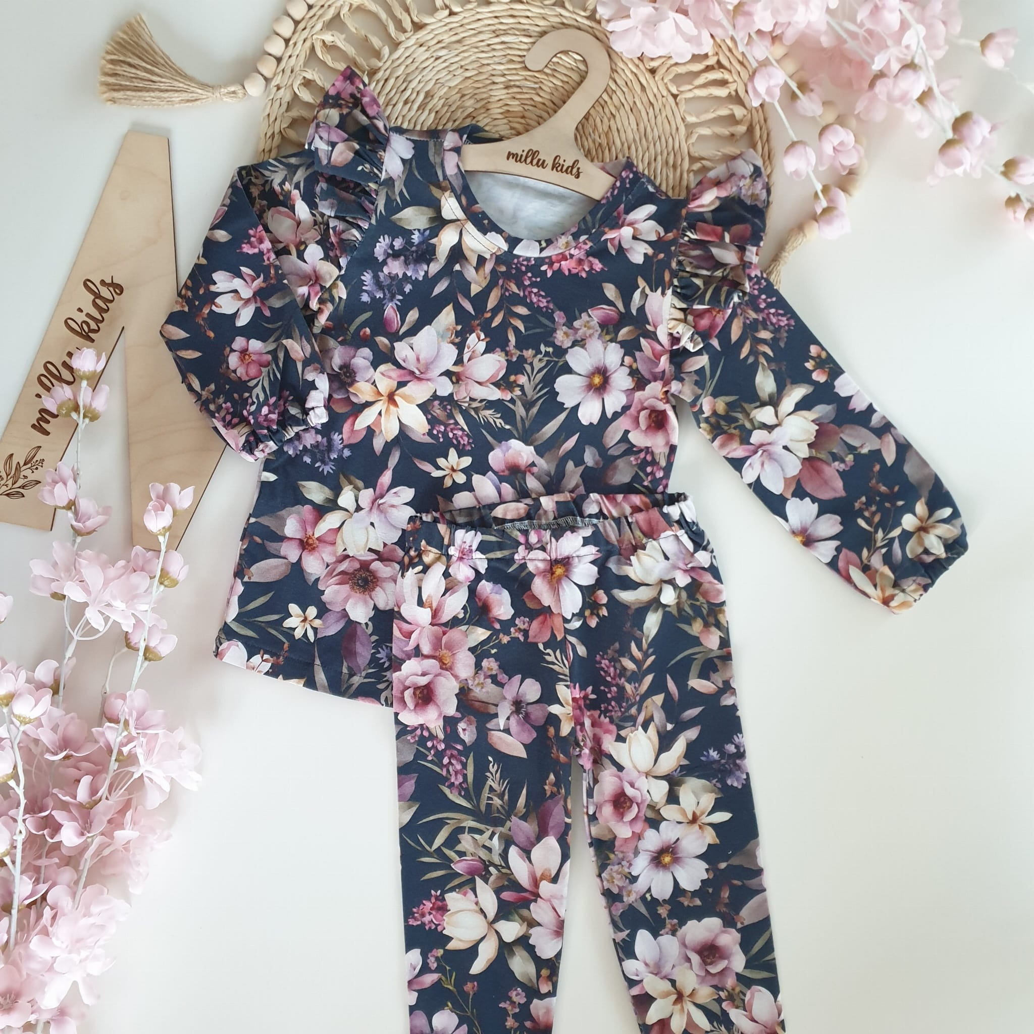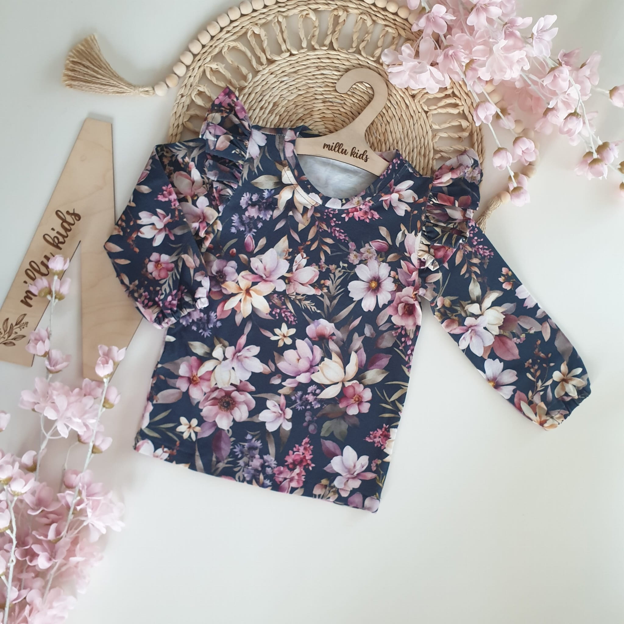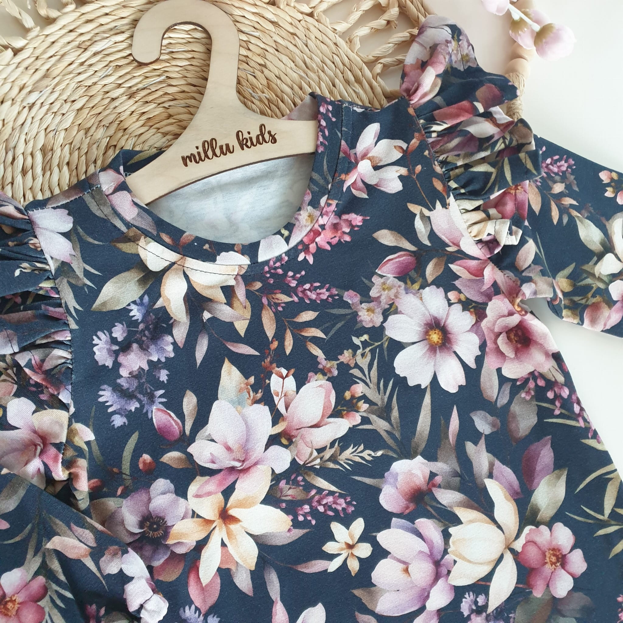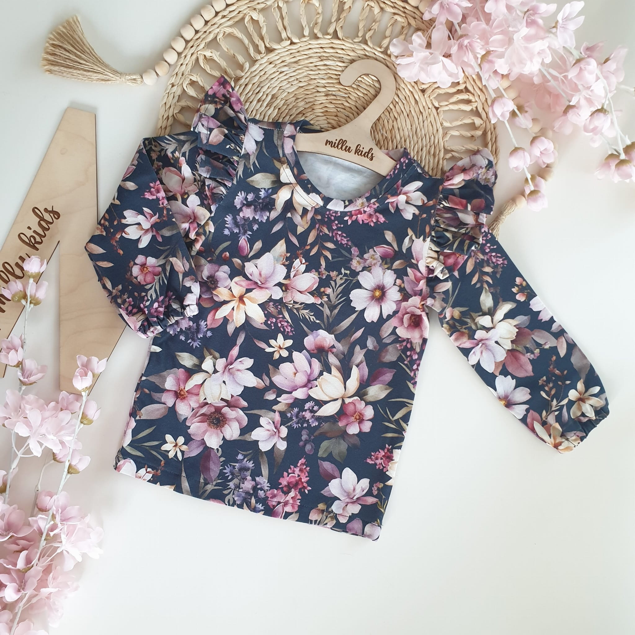 Bluzeczka w nadruk kwiatowy na ciemno granatowym tle.