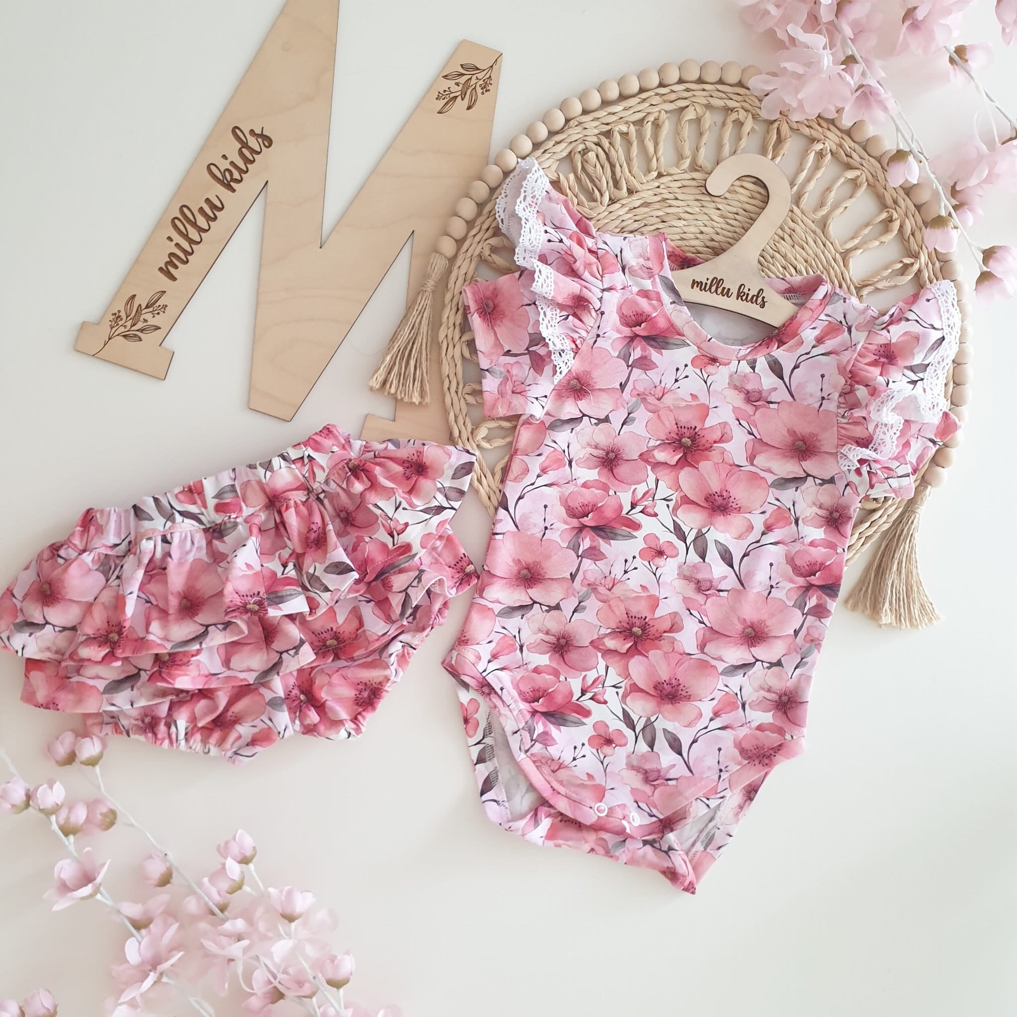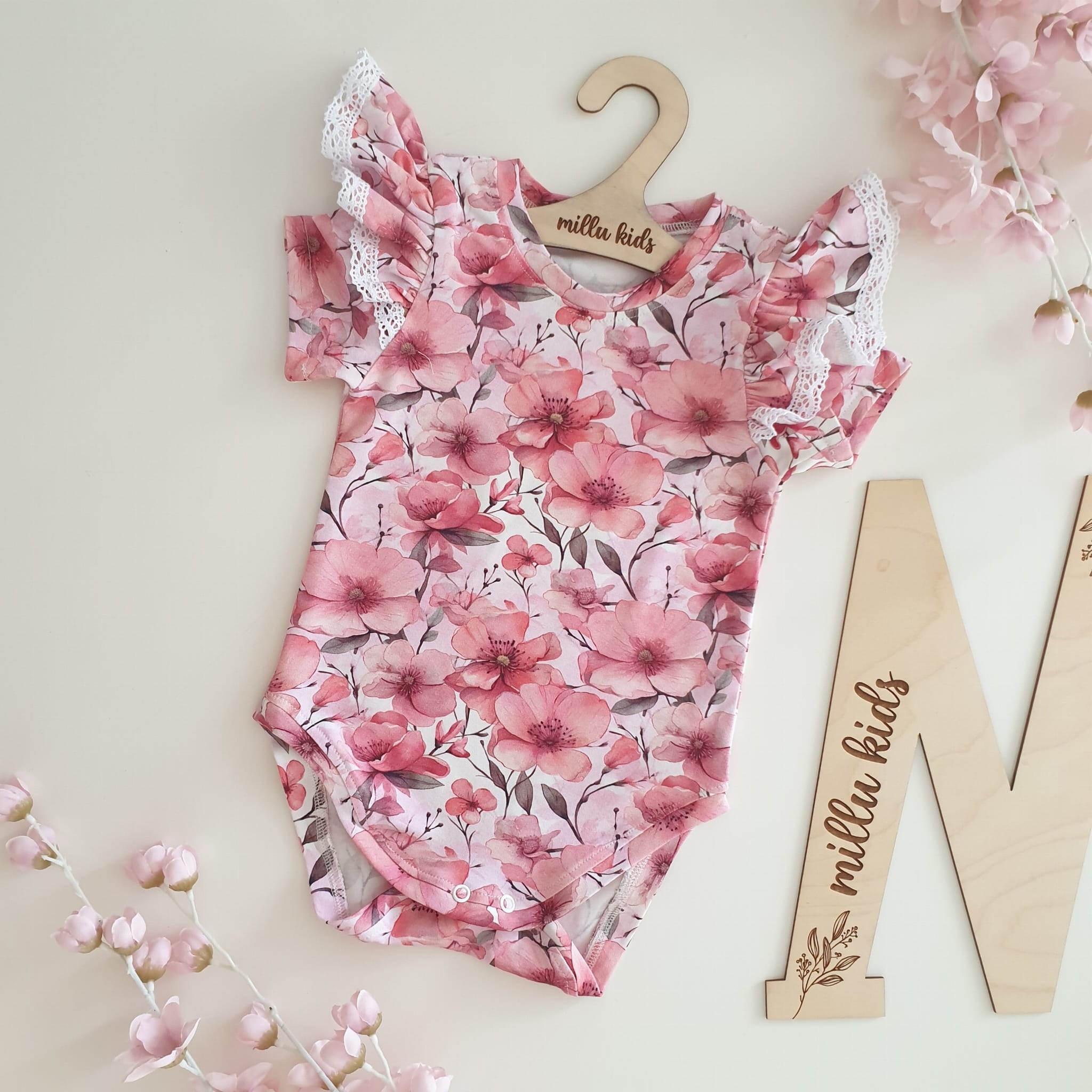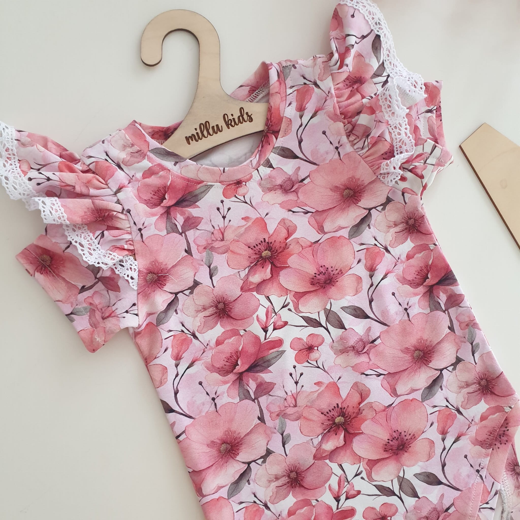 na jasno różowym tle, ozdobione na ramionach falbankami z