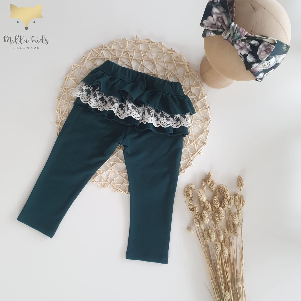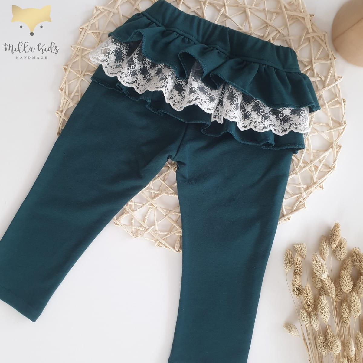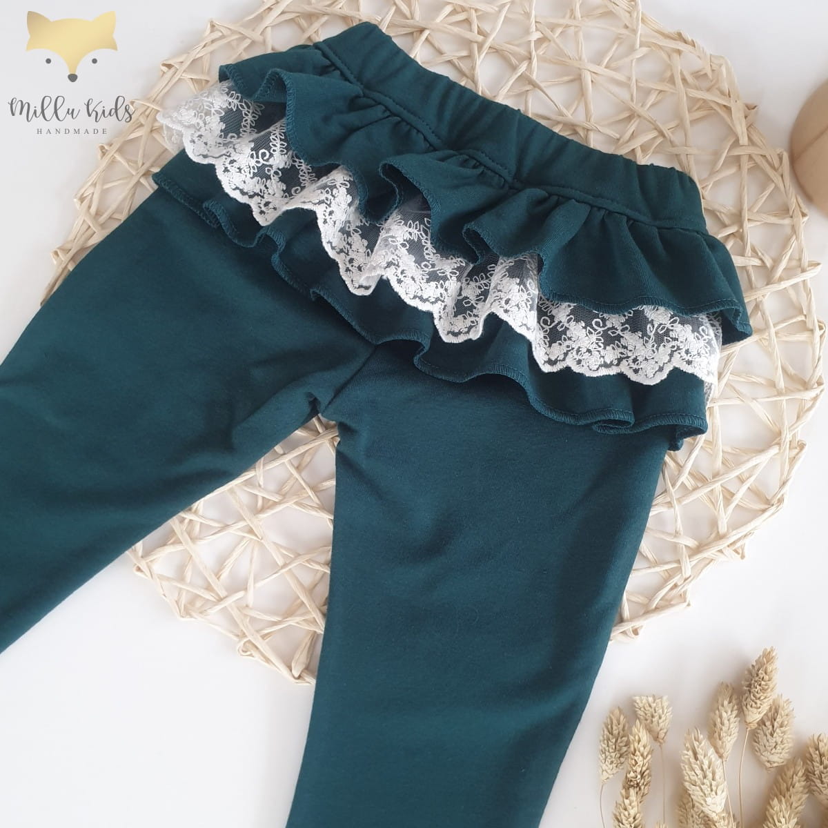 Spodnie z trzema falbankami na tyle ,środkowa falbanka z tiulowej koronki.